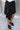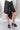 ヴィーガンレザーで作られた、無駄を一切排除したファッションの YURIE SKIRT は、赤と黒のストライプが見える裏地が特徴です。